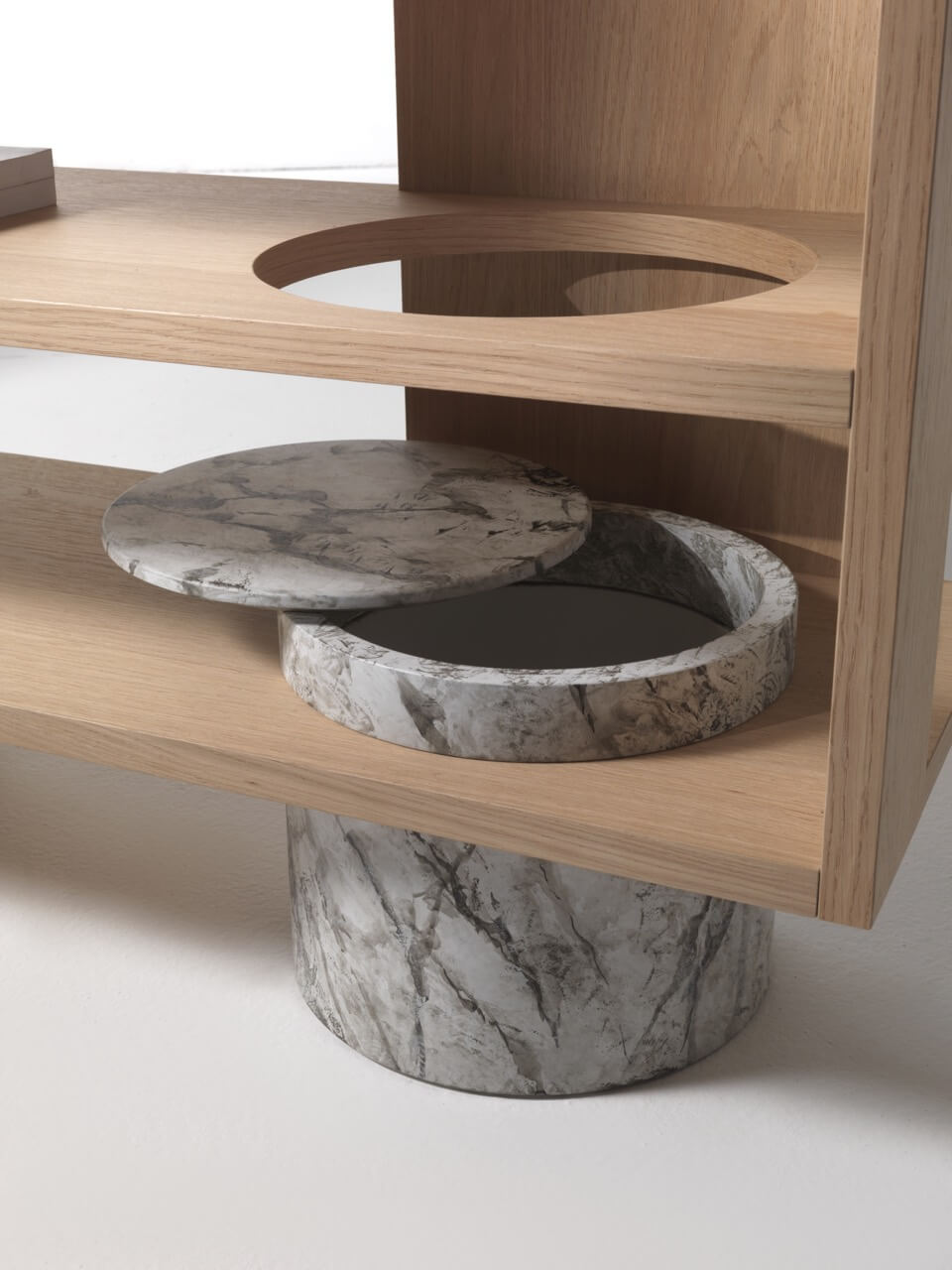 Libreria composta da struttura e ripiani in legno, con basamento realizzato da un piede in legno e da un volume che funge da portavaso o piedistallo in legno trattato. Una libreria idealmente attraversata da un corpo estraneo caduto dall’alto che, prima di impattare con il suolo, ha creato nei ripiani dei fori che ne ricalcano la forma. Lo spazio ricavato consente di inserirvi una pianta da vaso o una scultura, da far convivere con libri e altri oggetti.