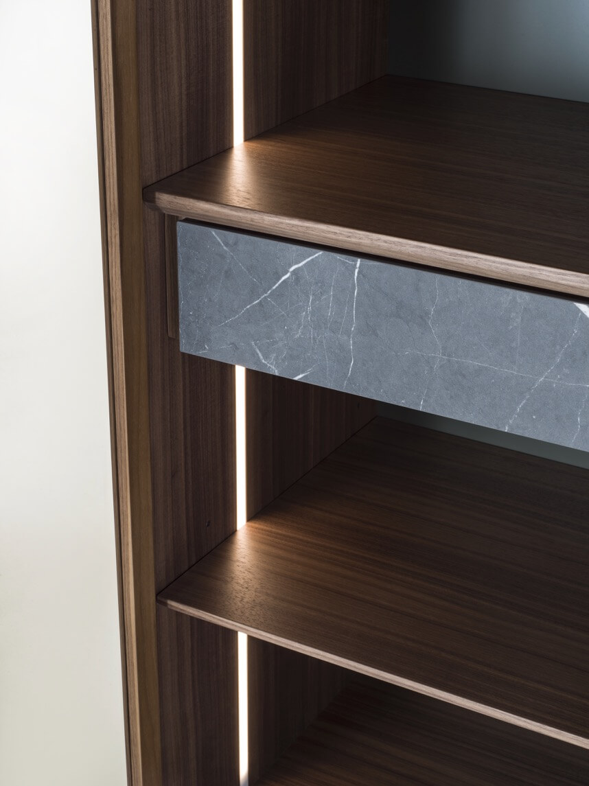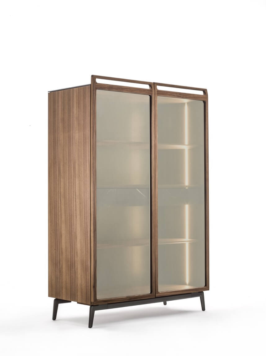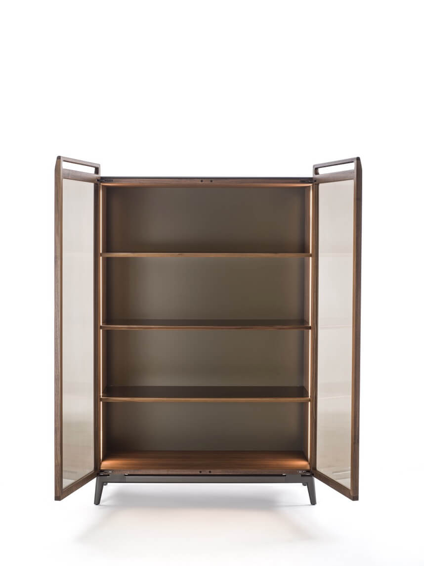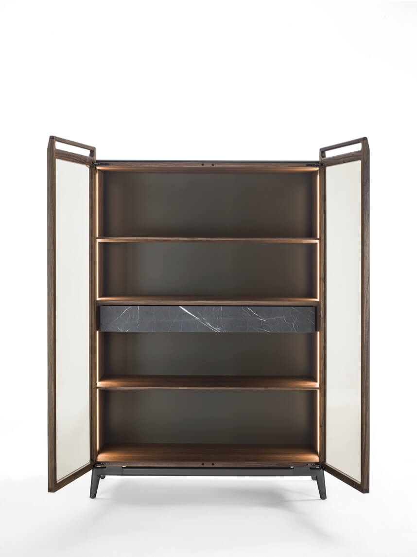 Struttura: legno massello e tranciato di noce canaletto / rovere / rovere nero. Piano: legno massello e tranciato di noce canaletto / rovere / rovere nero / gres porcellanato. Ante: legno massello e tranciato di noce canaletto / rovere / rovere nero / vetro con cornice di legno. Gambe: metallo laccato bronzo