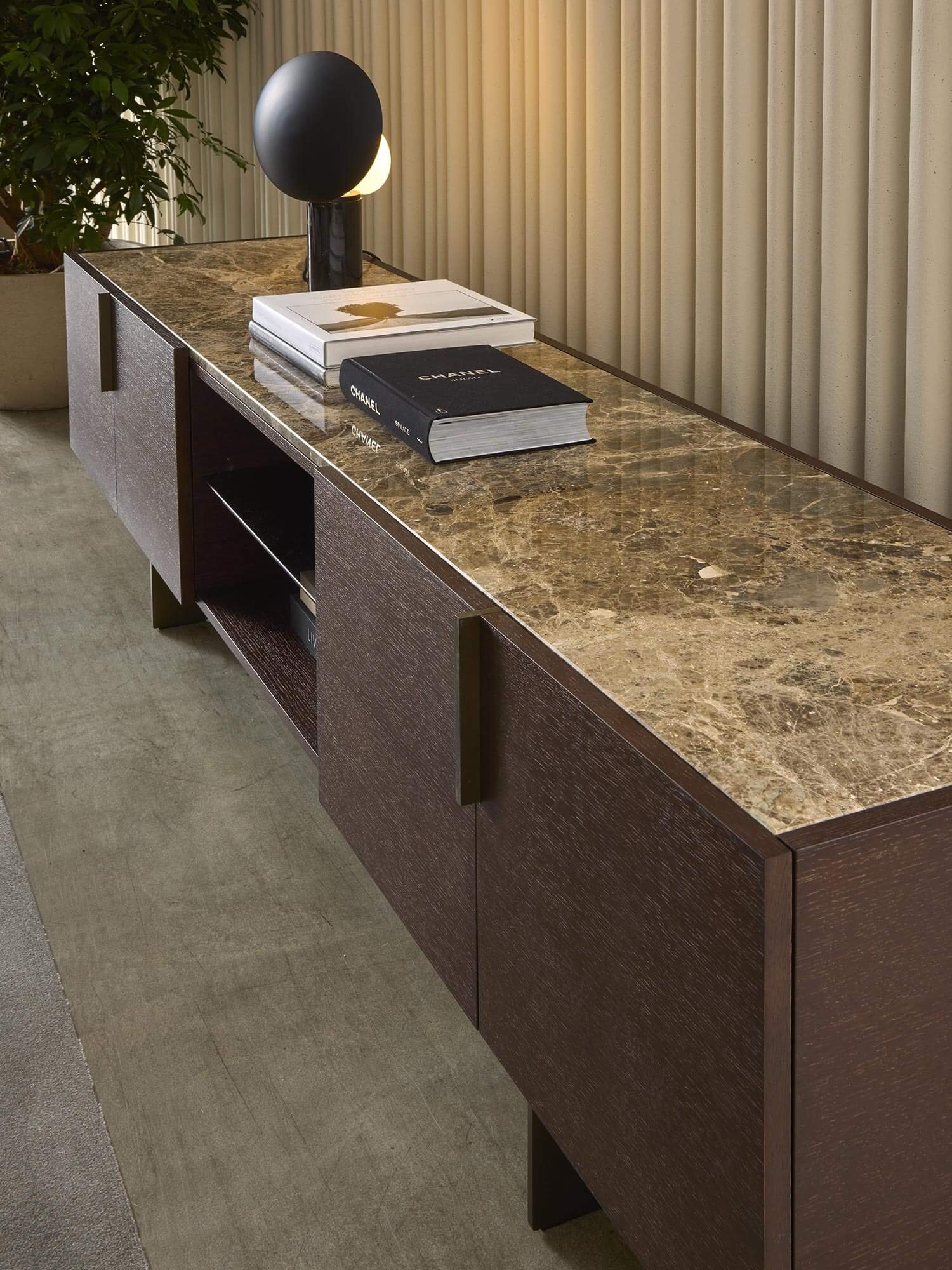 Il top è disponibile in marmo, vetro e legno, offrendo una vasta scelta di finiture per adattarsi al gusto e allo stile di arredamento desiderato. Le gambe in metallo e le maniglie sono in metallo e anche loro possono essere personalizzate in più di venti finiture.
