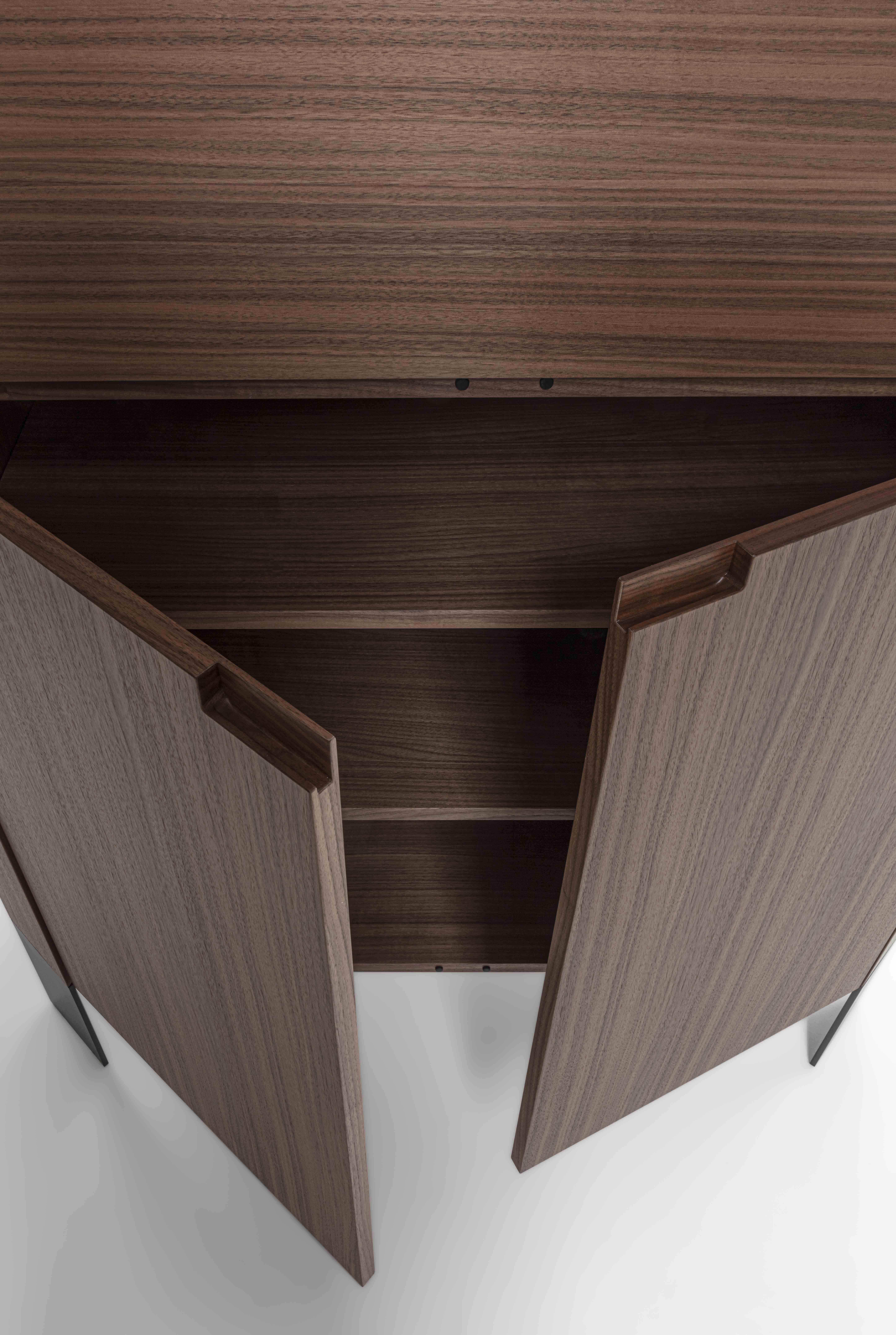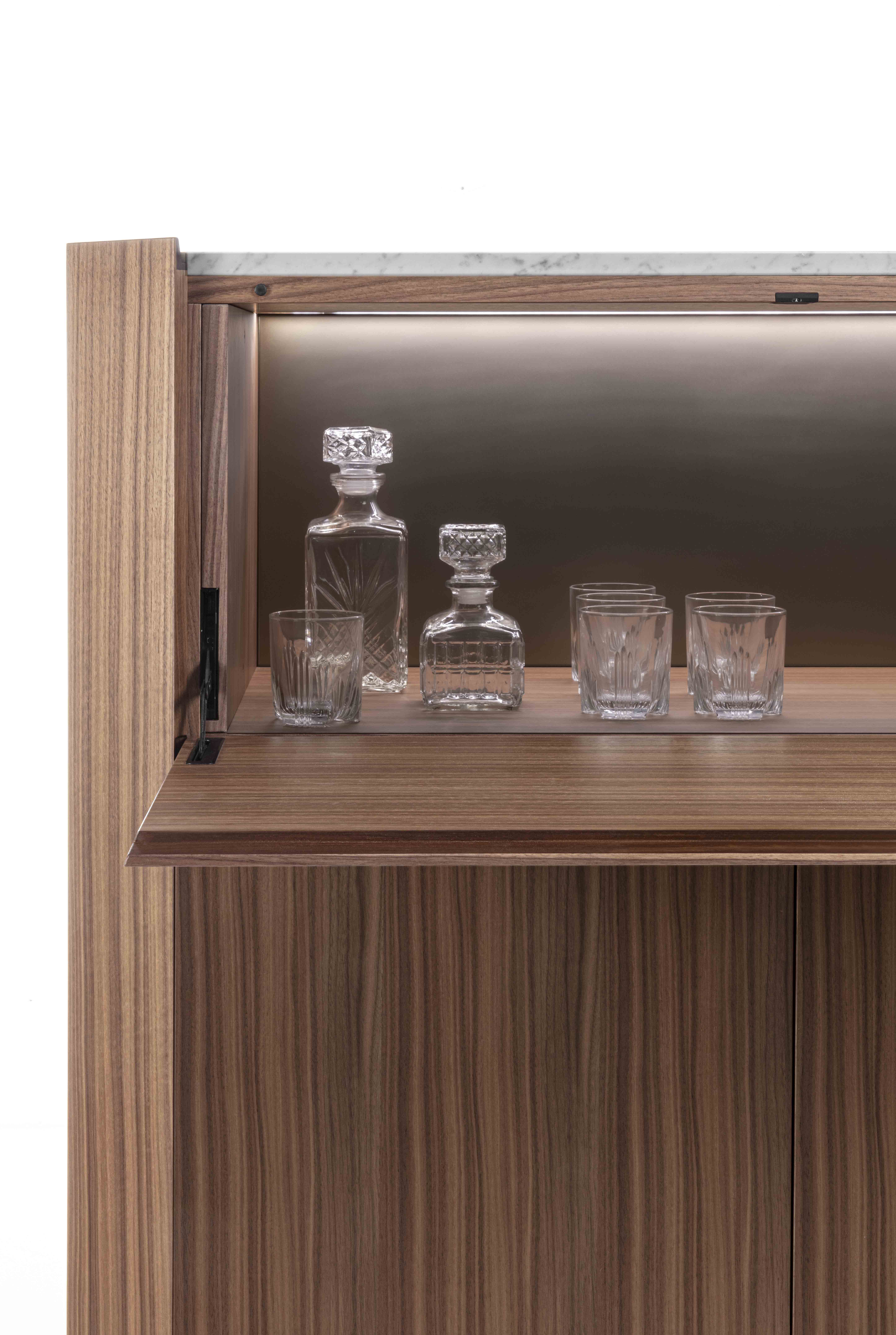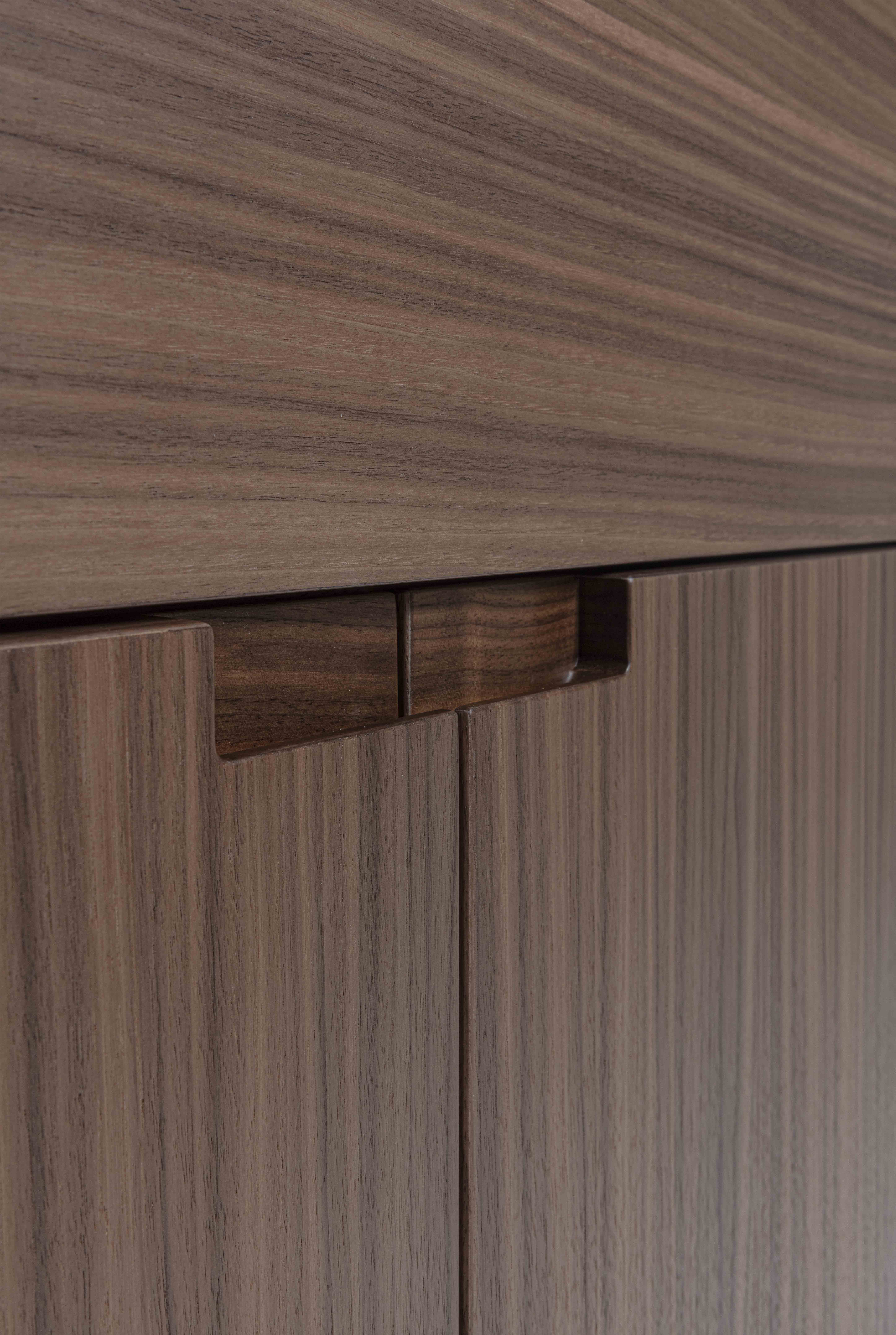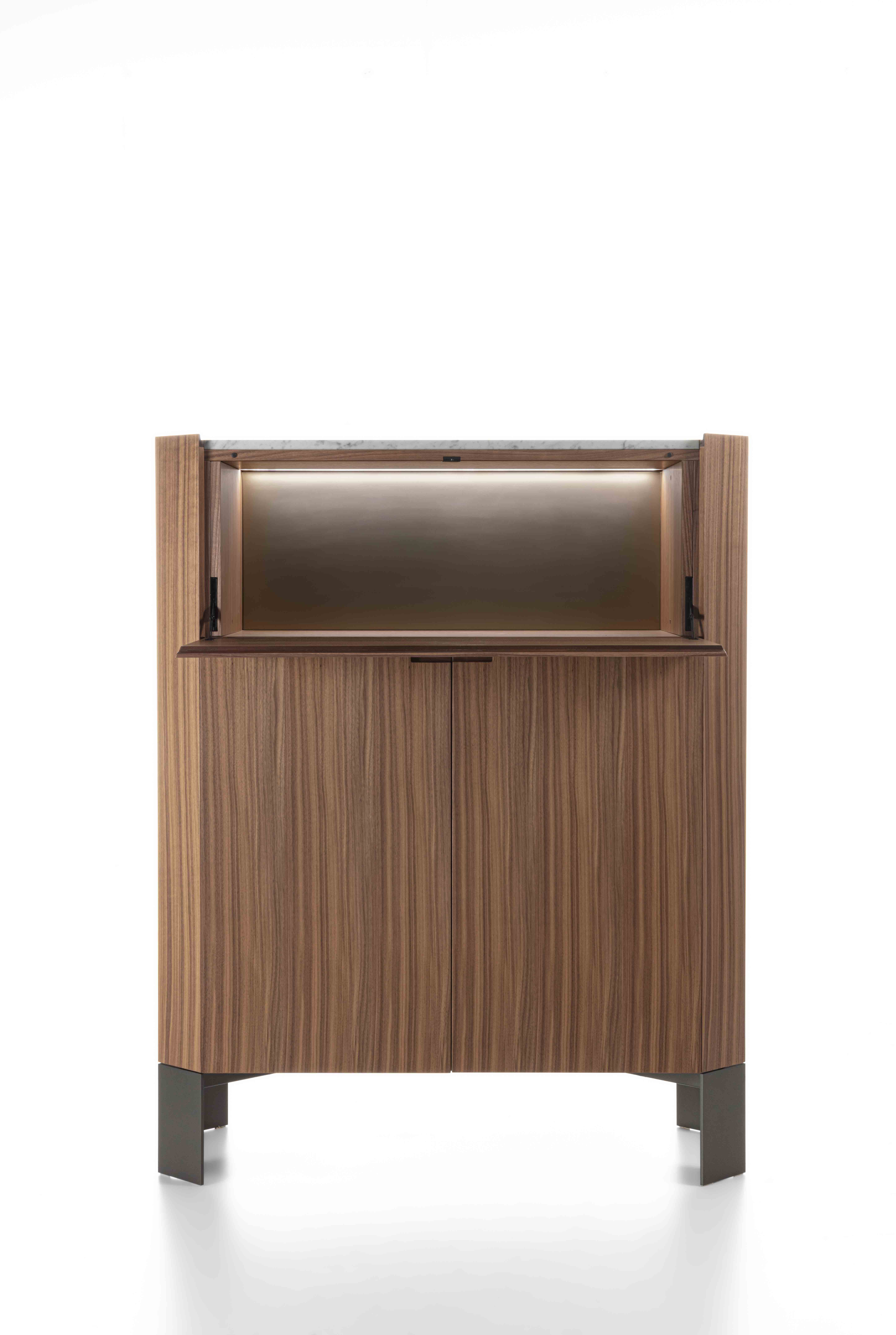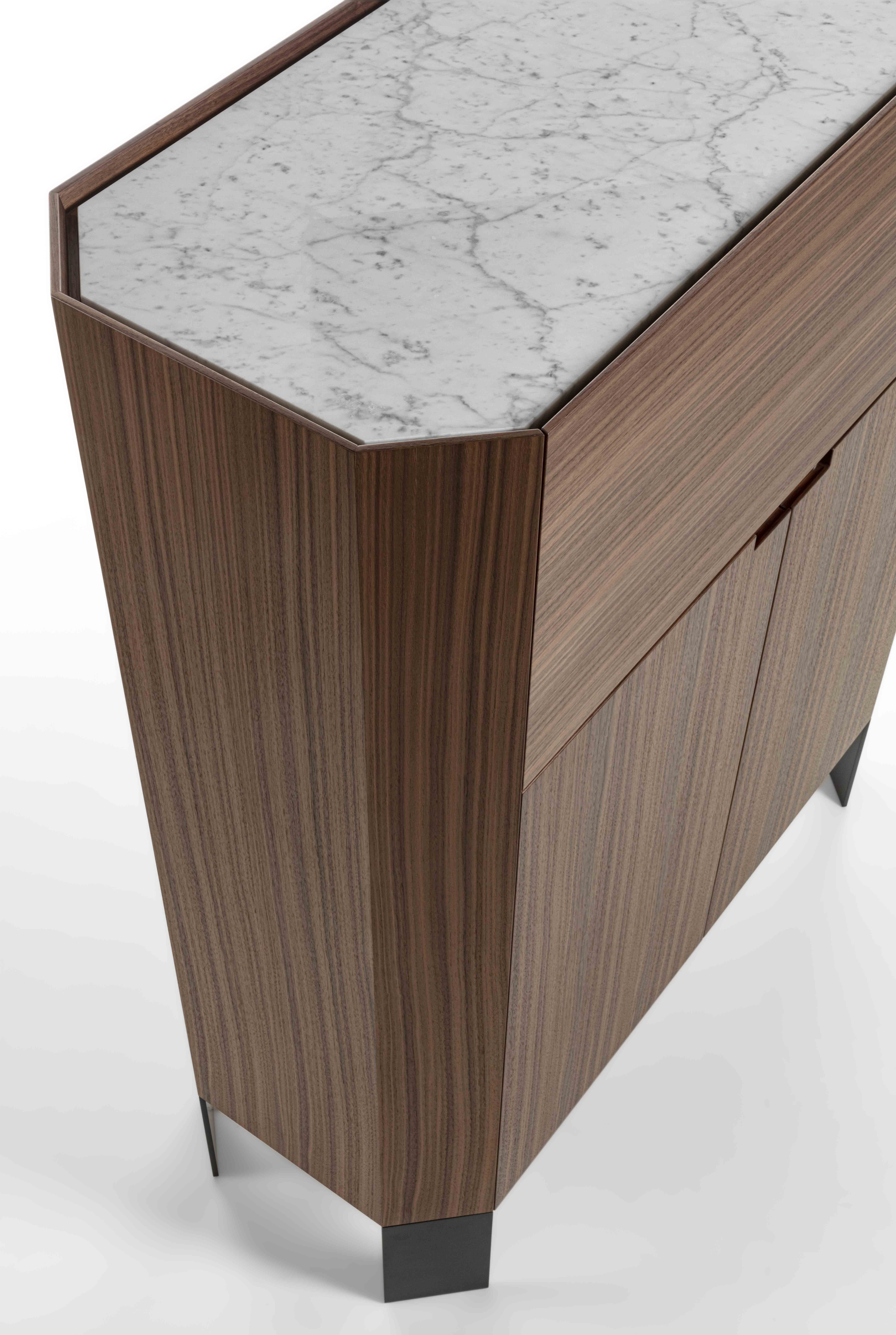 Struttura: legno massello e tranciato di noce canaletto / rovere / rovere nero. Piano: marmo. Ante: legno massello e tranciato di noce canaletto / rovere / rovere nero. Gambe: metallo laccato bronzo / canna di fucile.