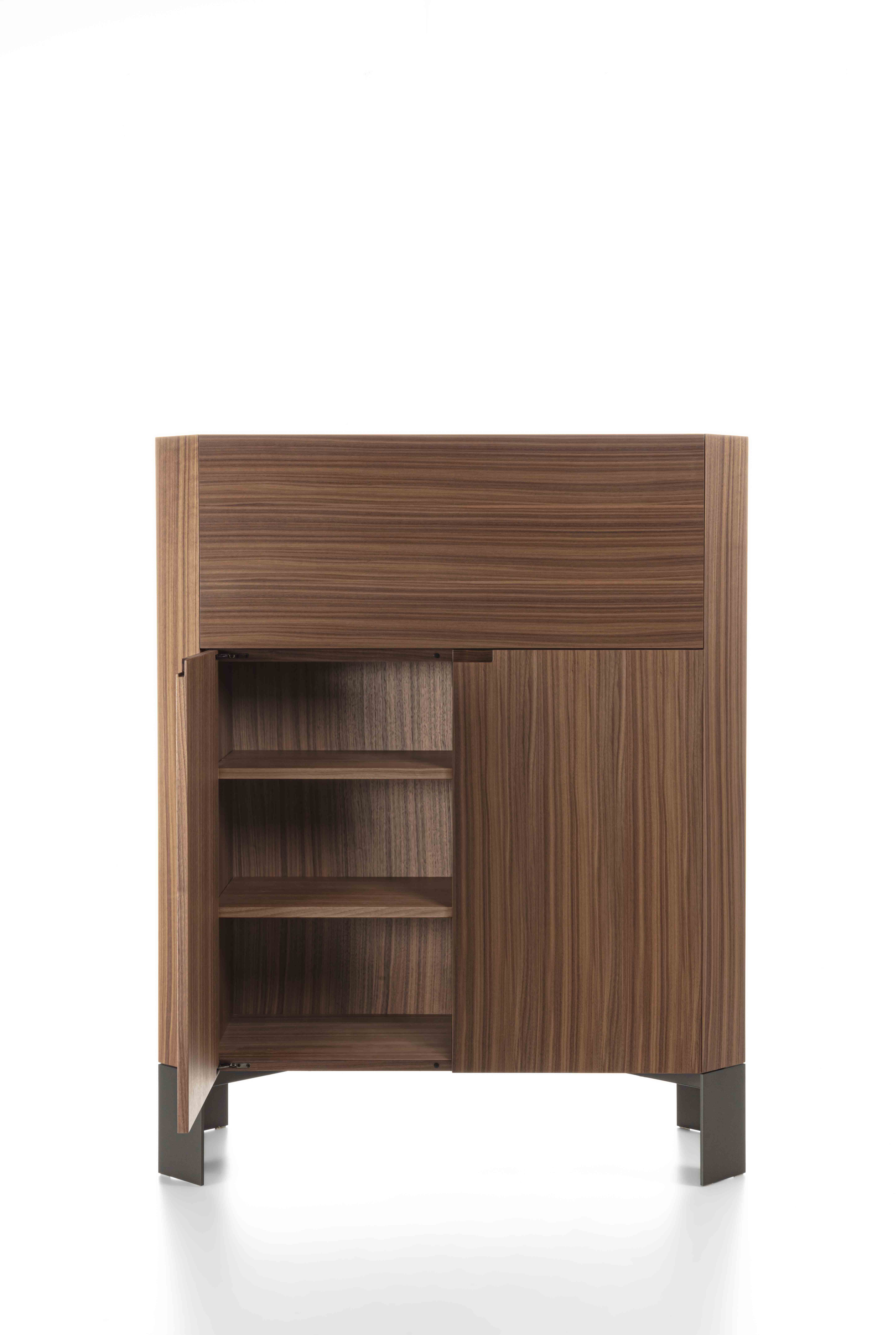 Mobile contenitore con ante e/o ribalta in legno e piano in marmo o legno. Il basamento è in metallo e la ripartizione interna è caratterizzata da ripiani in legno.