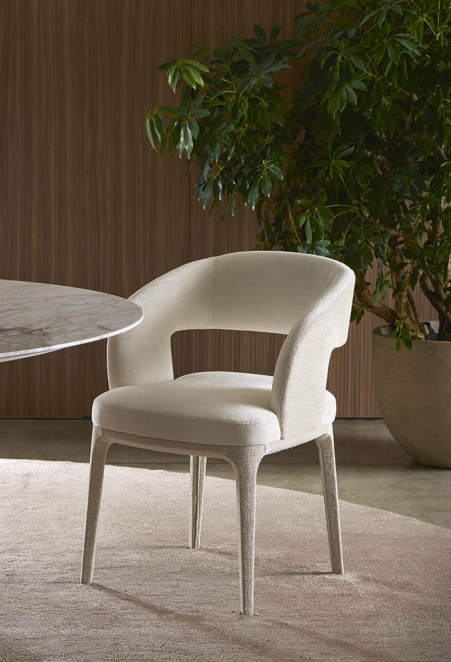 Bea è disponibile sia come sedia che come sgabello e può essere fornita con o senza braccioli per soddisfare diverse esigenze di design. La struttura in legno massiccio garantisce stabilità e qualità artigianale. Per una finitura ancora più raffinata, la sedia può essere rivestita in tessuto o in pelle. La seduta imbottita può essere personalizzata con una varietà di rivestimenti e, per un tocco esclusivo, è possibile combinare due materiali diversi, ad esempio tessuto e pelle, per creare sofisticati contrasti materici.