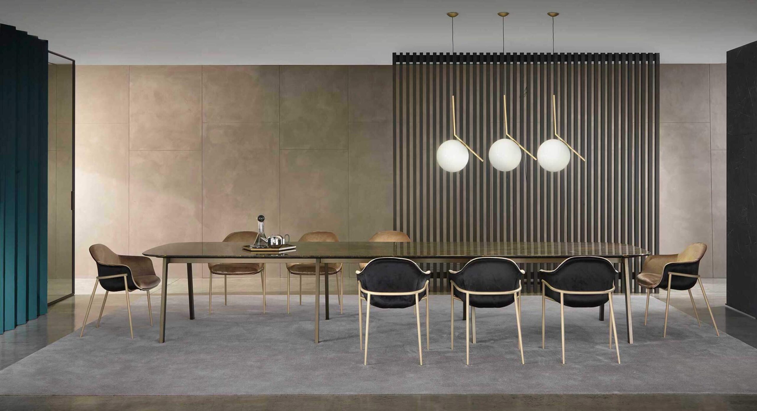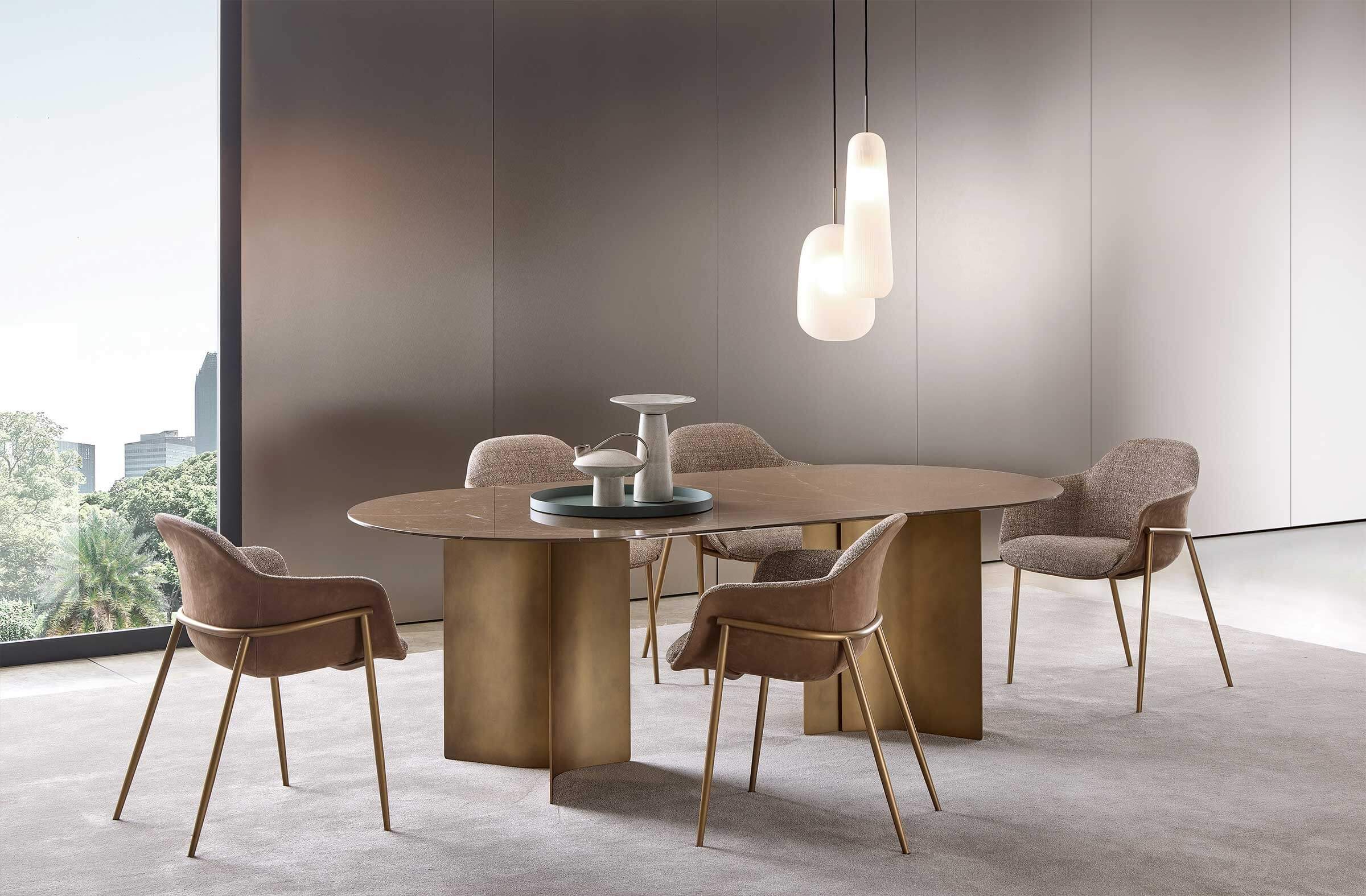 Pensata per rispondere alle esigenze di architetti e interior designer, si distingue per la varietà dei suoi basamenti, che le permettono di adattarsi con disinvoltura a contesti diversi. La versione con quattro gambe, disponibile in metallo o legno, coniuga solidità e leggerezza, rendendola perfetta per ambienti residenziali dal carattere ricercato. Per gli ambienti contract, è disponibile con colonna centrale, proposta con base tonda o a quattro razze, perfetta per uffici, ristoranti e hotel che necessitano di funzionalità senza rinunciare all’eleganza.