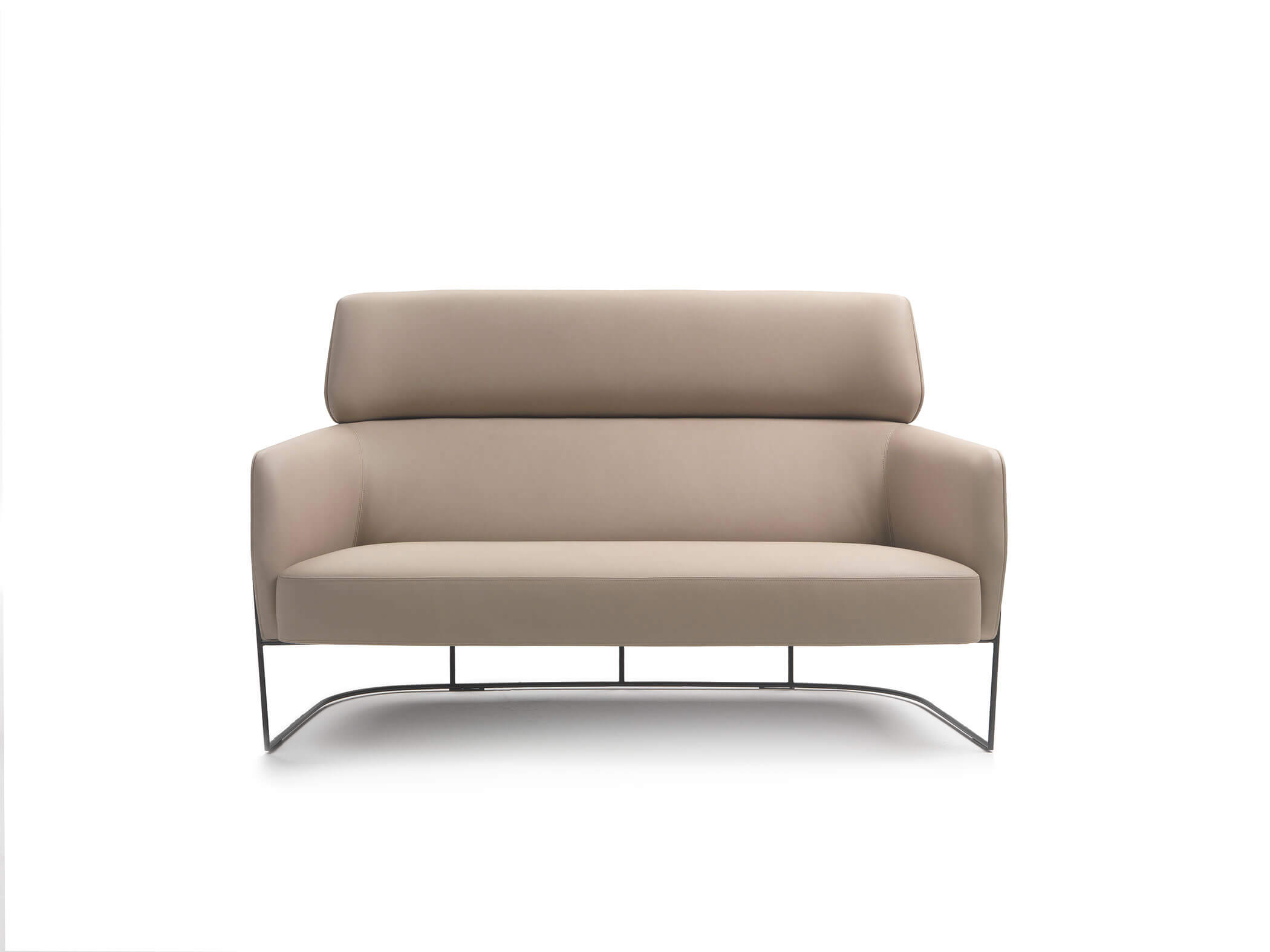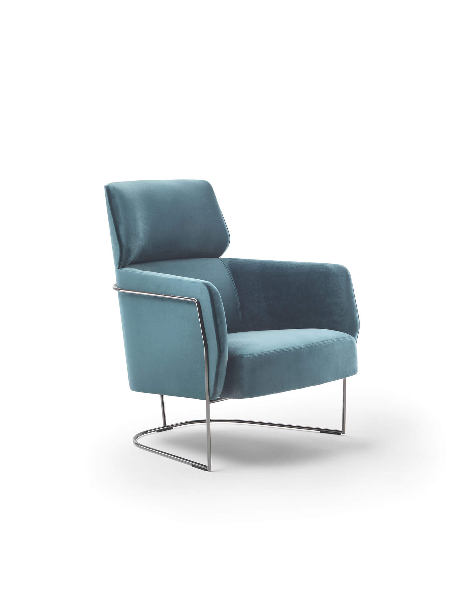 La morbida e curvilinee scocca viene sorretta da un elegante struttura in metallo disponibile in diverse finiture.