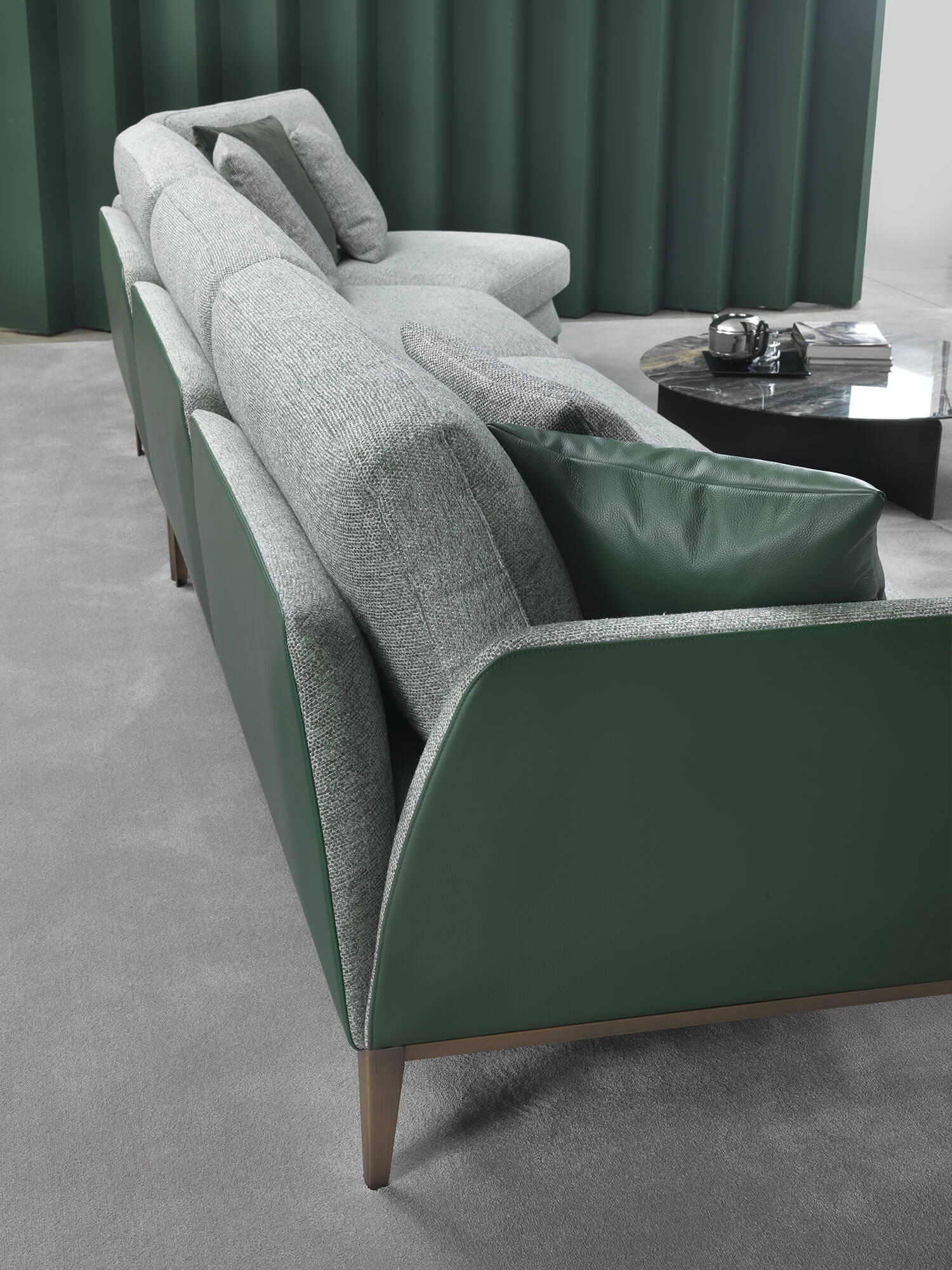 Elemento altrettanto importante di questa collezione questi prodotti è la loro elevata personalizzazione. Possono essere realizzati con una combinazione di colori e materiali, ad esempio, con la parte esterna dei braccioli e dello schienale in pelle, mentre i cuscini di seduta e di schienale e la struttura interna in tessuto. Grazie alla vasta scelta di pelli, tessuti e finte pelli disponibili, è possibile ottenere infinite soluzioni di personalizzazione. Anche la base in metallo può essere rifinita in oltre 20 diverse finiture, in base al contesto e alle preferenze estetiche.