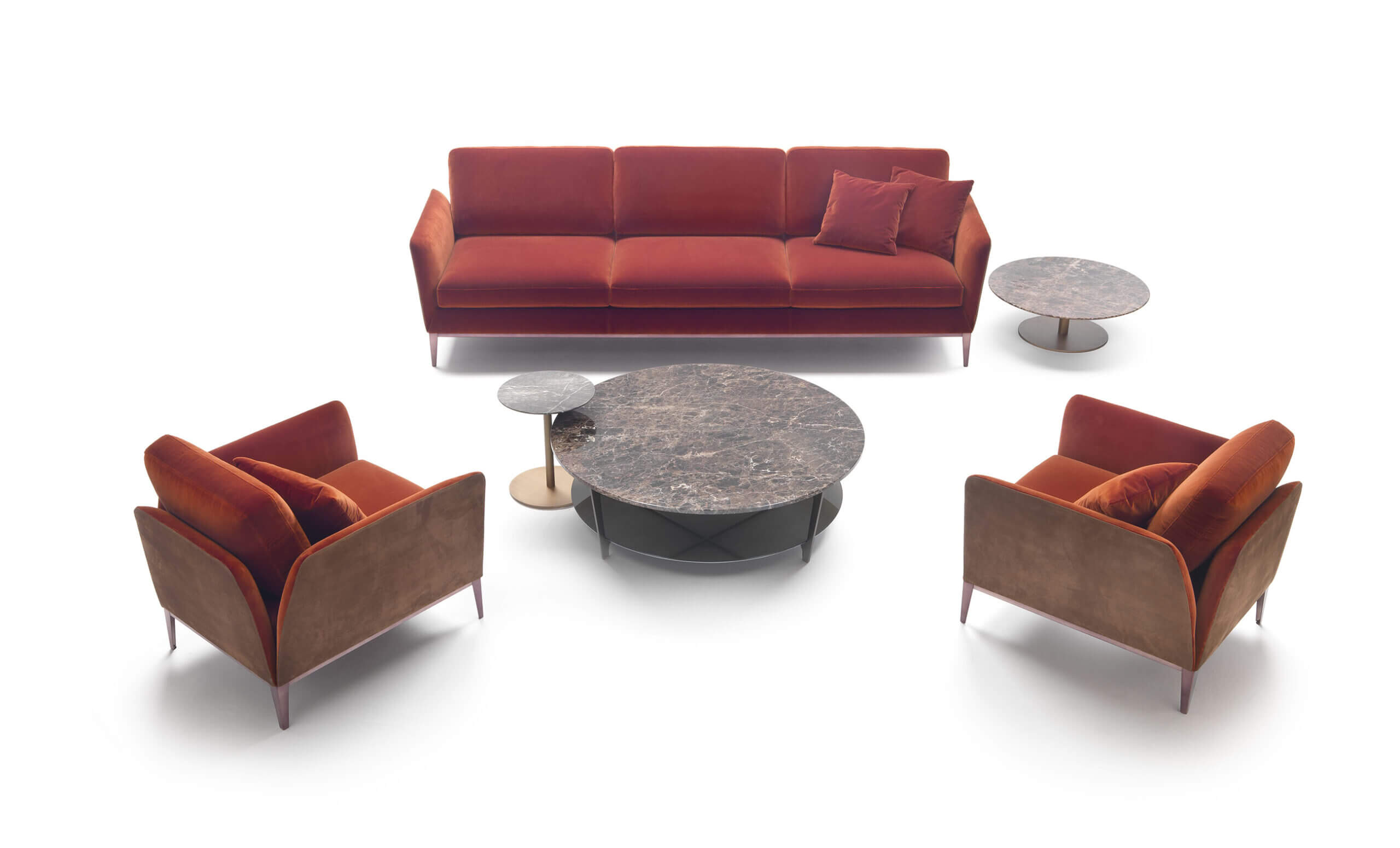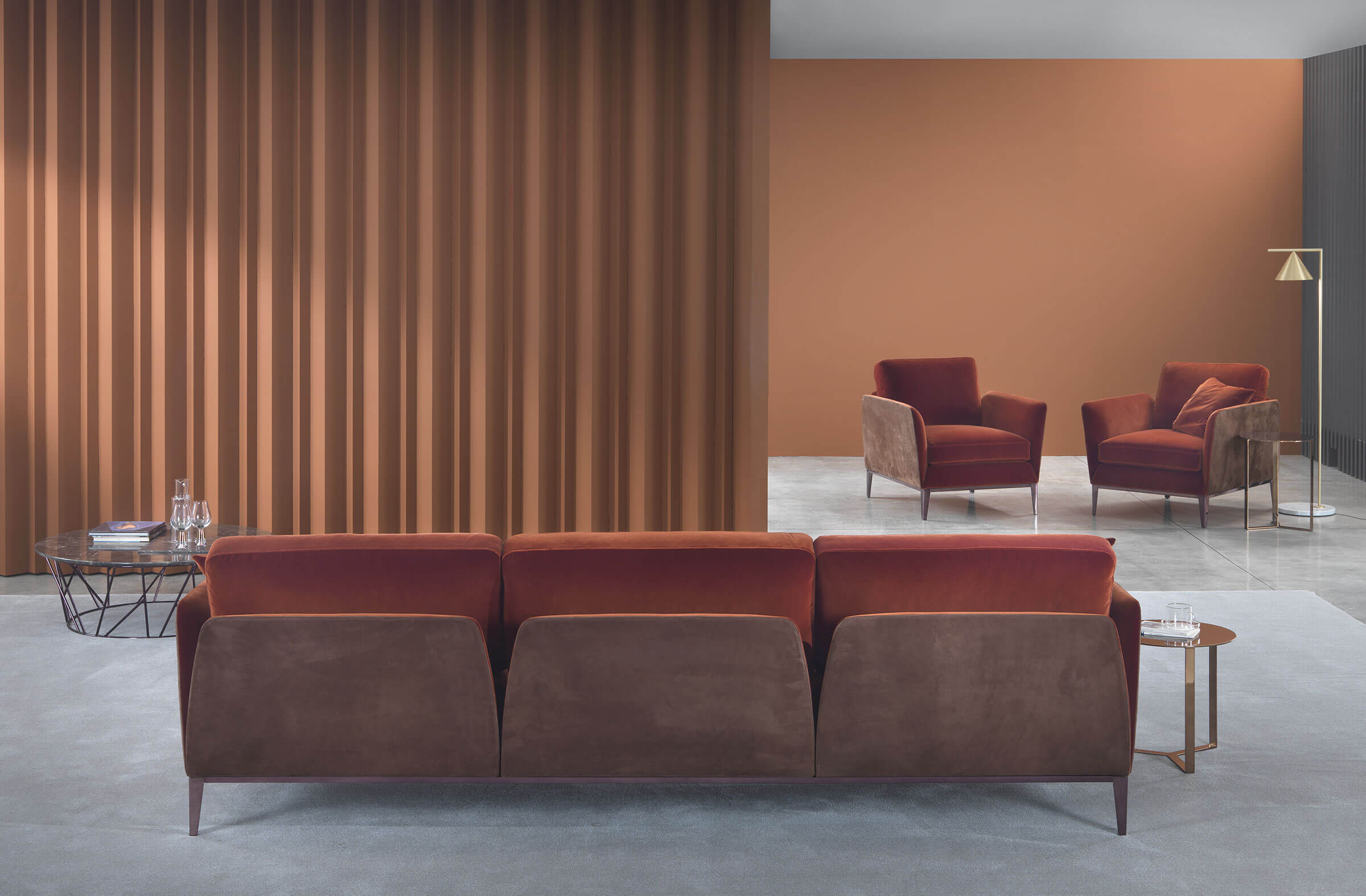 Elemento altrettanto importante di questa collezione questi prodotti è la loro elevata personalizzazione. Possono essere realizzati con una combinazione di colori e materiali, ad esempio, con la parte esterna dei braccioli e dello schienale in pelle, mentre i cuscini di seduta e di schienale e la struttura interna in tessuto. Grazie alla vasta scelta di pelli, tessuti e finte pelli disponibili, è possibile ottenere infinite soluzioni di personalizzazione. Anche la base in metallo può essere rifinita in oltre 20 diverse finiture, in base al contesto e alle preferenze estetiche.