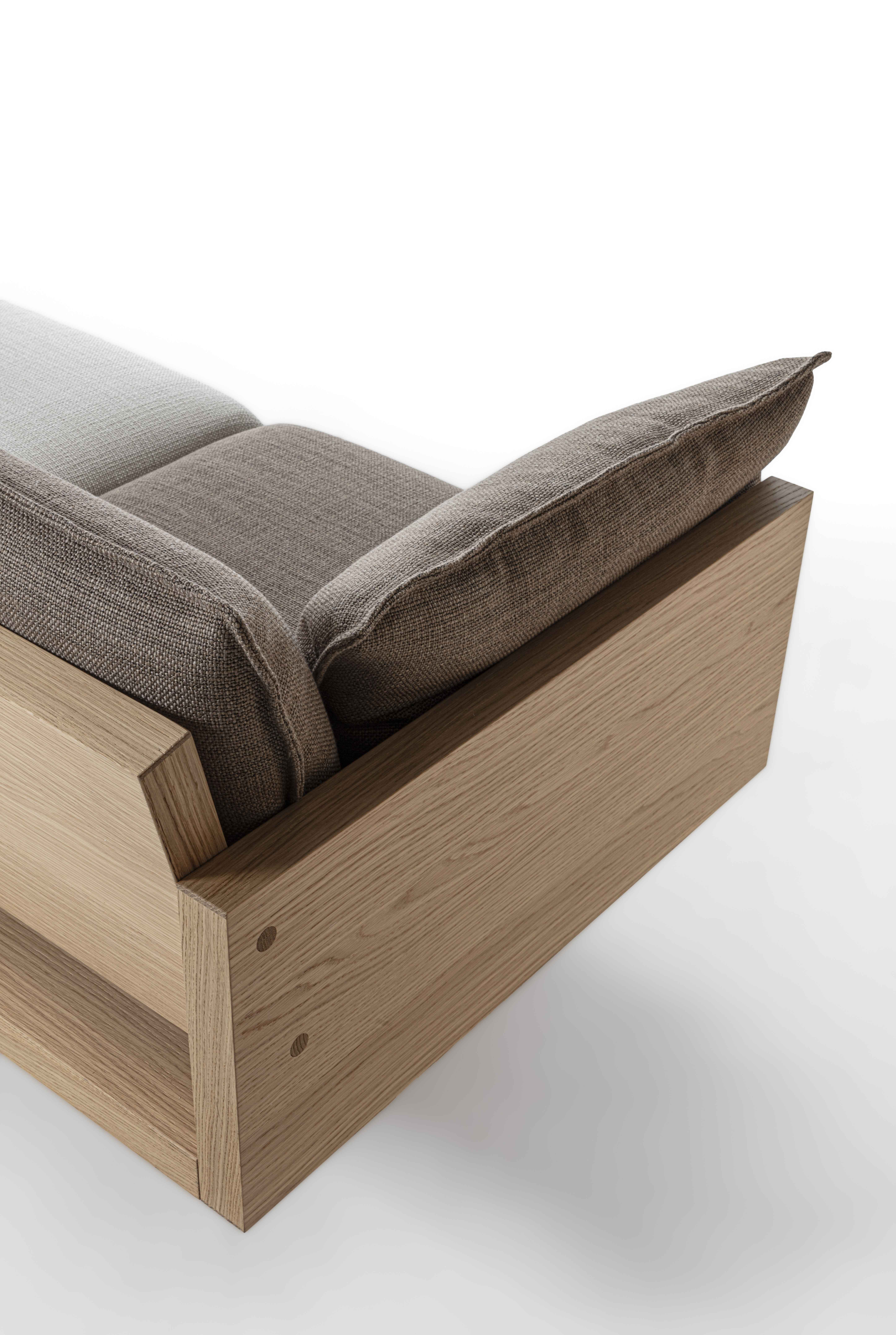 Divano con struttura in legno, con imbottiti rivestiti in tessuto o pelle che sviluppano sedute, schienali e braccioli.
