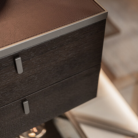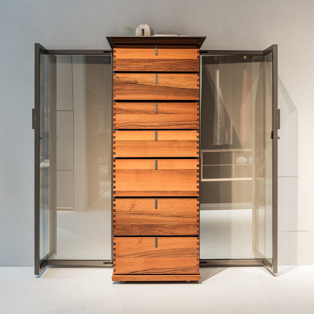 Inside, walnut-veneered drawers constructed with traditional dovetail joints provide both aesthetic appeal and structural integrity. Suspended on concealed internal structures, these drawers appear to float within the cabinet, emphasizing the minimalist design.