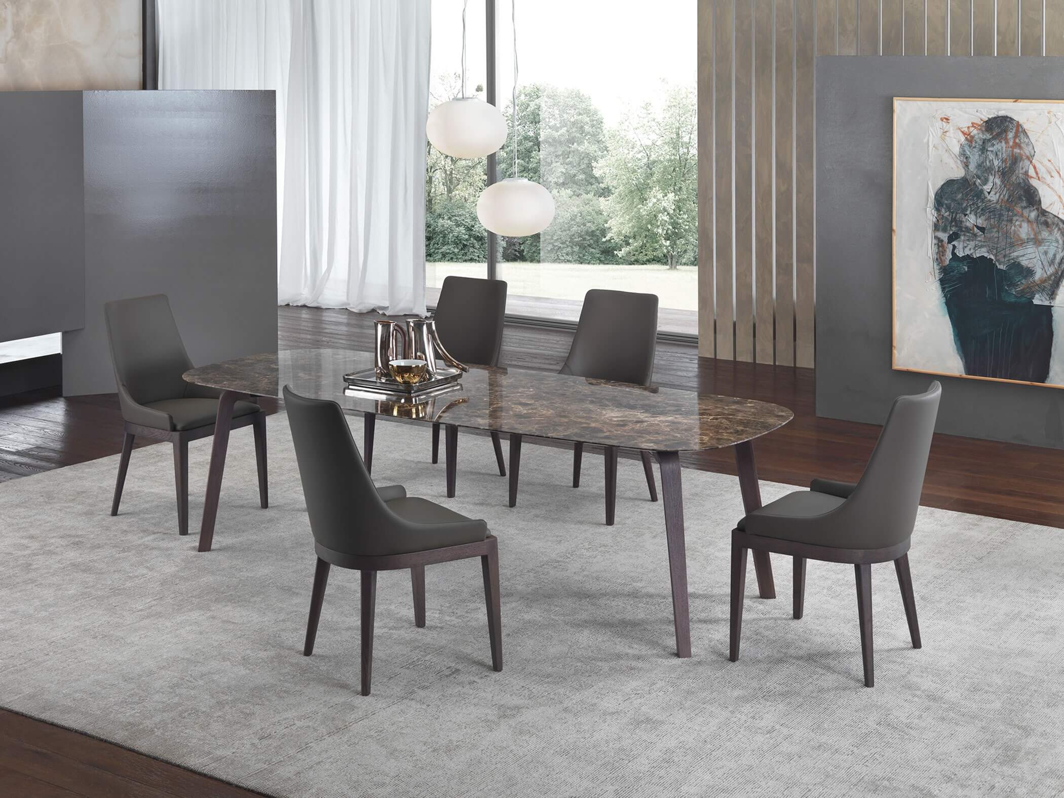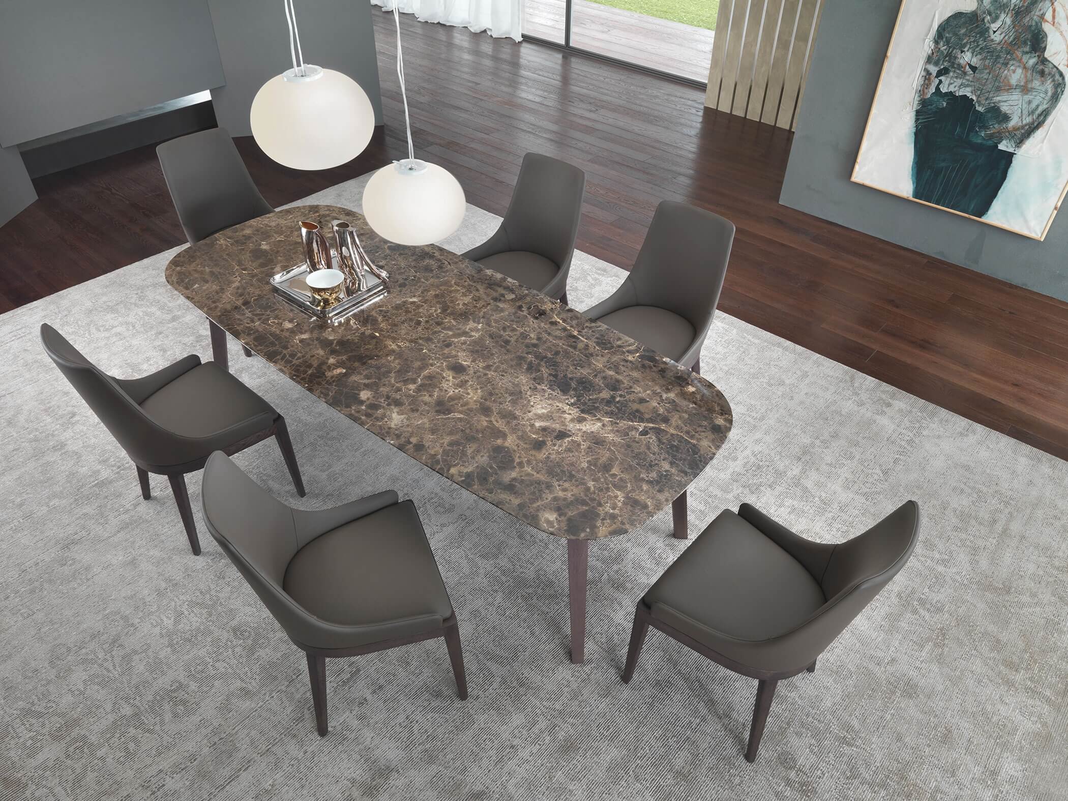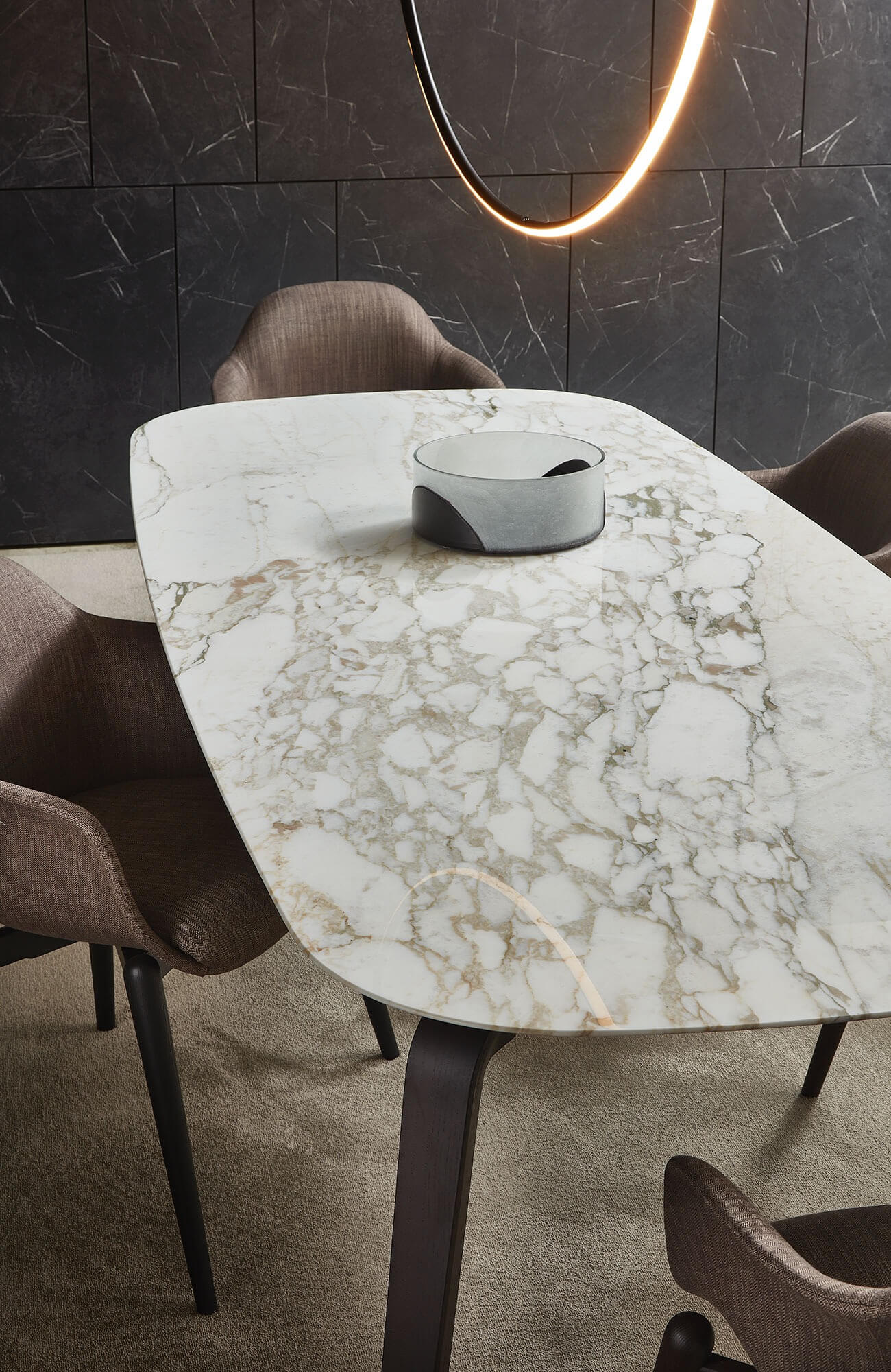 Il top rettangolare con angoli stondati conferisce un tocco di raffinata eleganza senza compromettere la funzionalità. Le finiture sono curate con estrema attenzione e riflettono un’alta qualità artigianale. La base del tavolo è realizzata in metallo rivestito in legno massello e presenta una lavorazione di precisione. Inoltre, è possibile scegliere tra diverse opzioni per il piano del tavolo, tra cui legno e marmo, offrendo una vasta selezione di finiture tra cui selezionare.