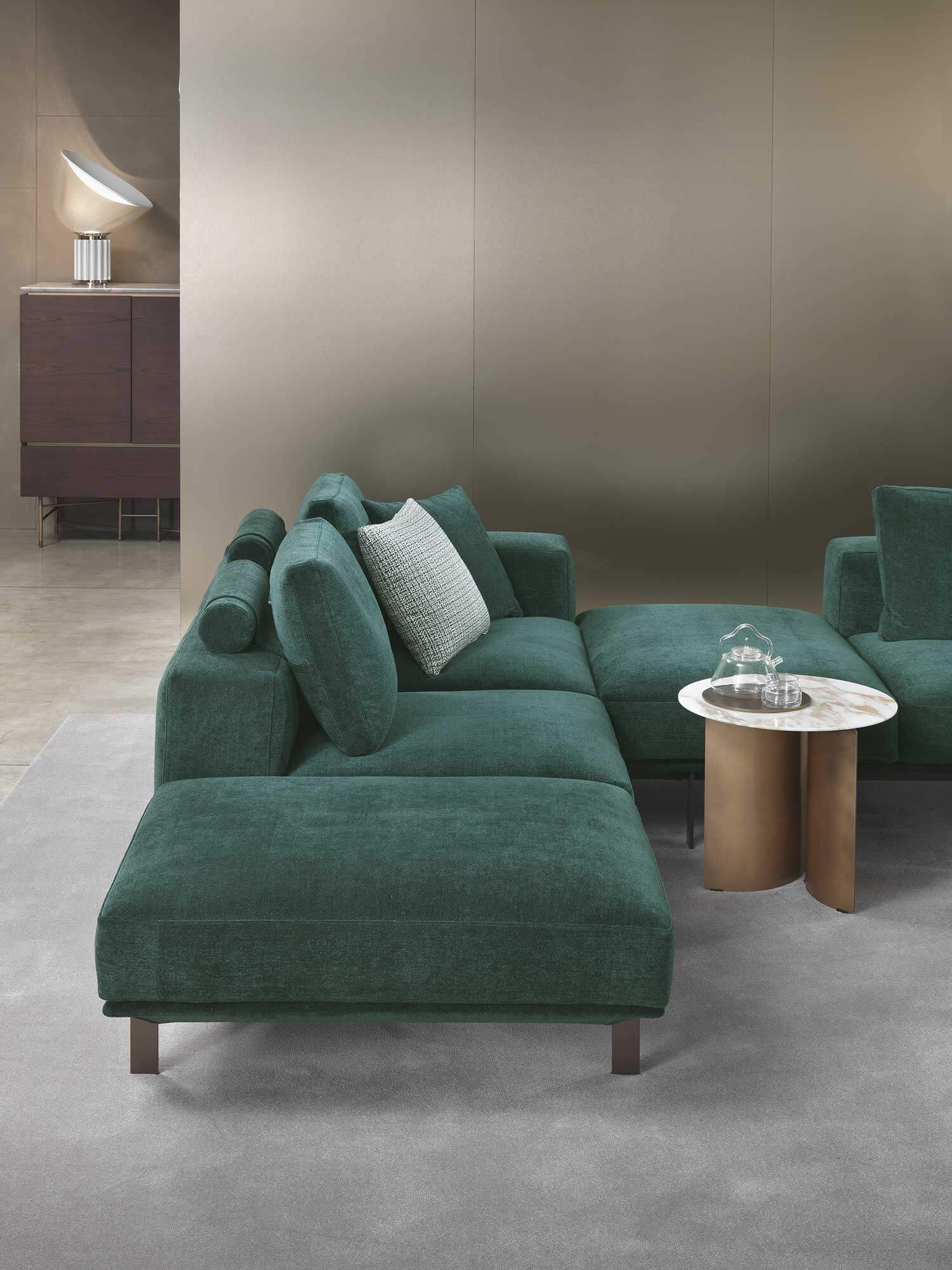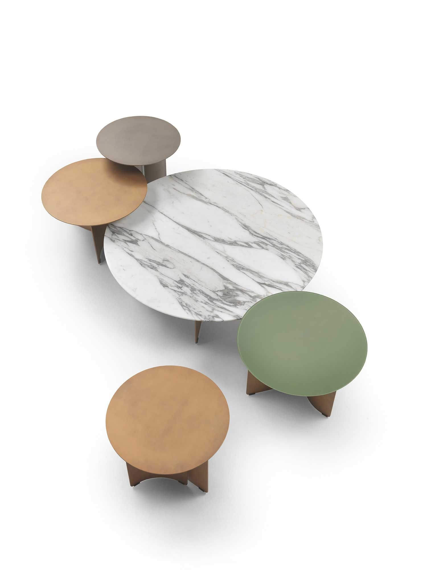 Le basi in acciaio, proposte nelle nuove e sofisticate finiture metalliche Delabrè o Peltro, aggiungono ulteriore ricercatezza e assicurano solidità strutturale senza appesantire l’estetica complessiva.